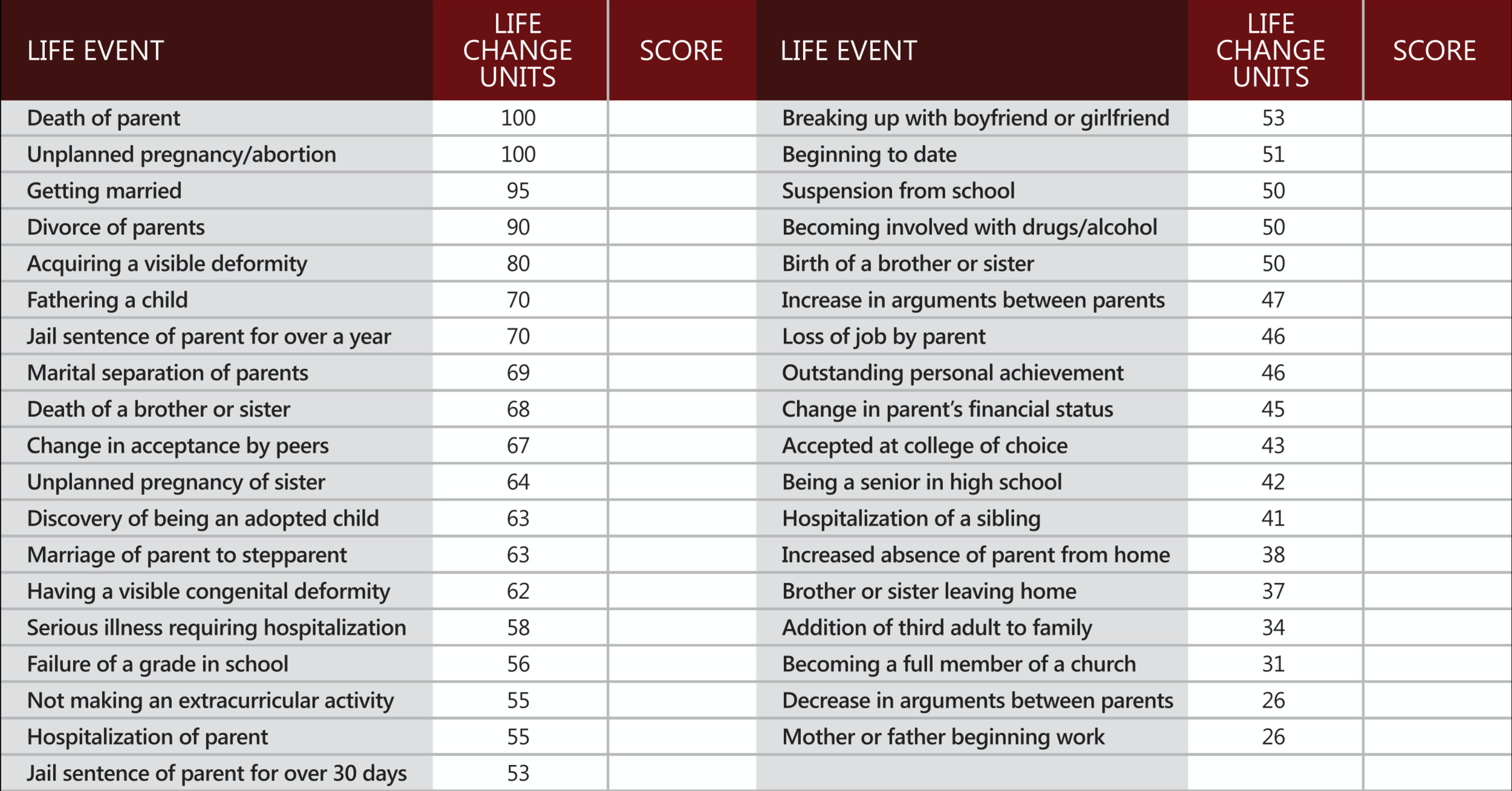 What’s the message in the quote? What was wrong with Rourke’s decision-making? It hinges on our past selves, because who we are today is a product of our past. We have all suffered in our past. Some may have deep trauma that is obvious. The loss of a child or spouse. There is a scale for this called the Holmes-Rahe Stress Inventory, and these two sit at the top. There’s also a similar one for non-adults, which I include below. Note that getting accepted to your college of choice is on the list. It is, indeed, a stressful life change, and I include it because for many of my firm’s clients I have seen this.